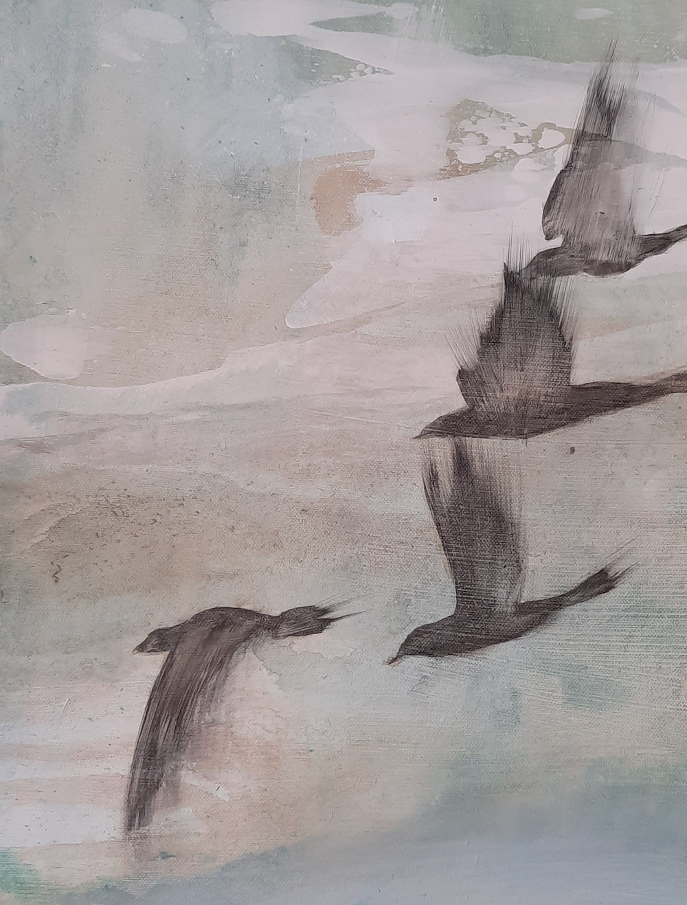 The visceral swoop and rush of birds in flight, the sound of their wings moving the air as they skim overhead, the feeling of freedom and aliveness transmitted to us as we stand below and look up.