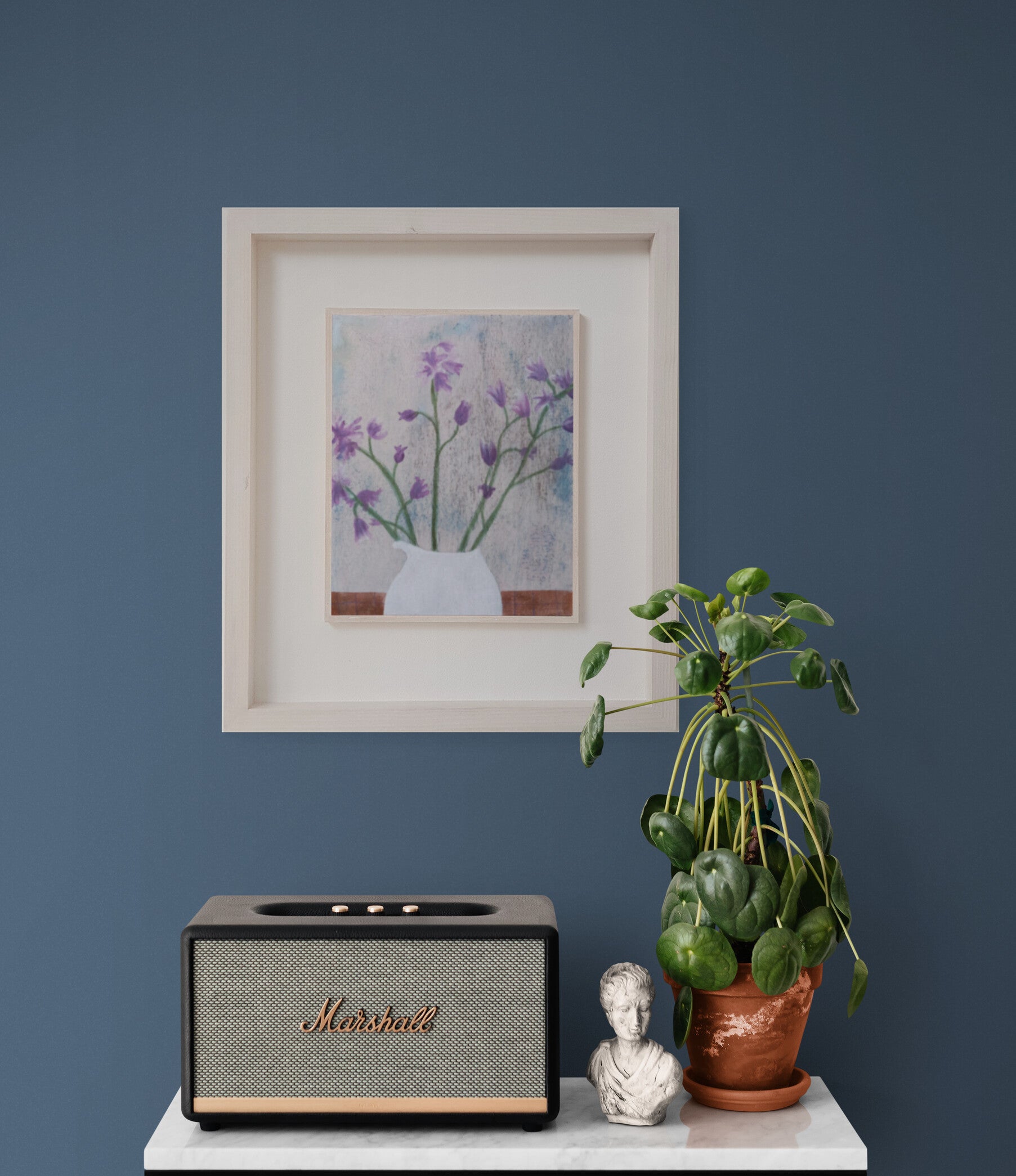 Bluebells, picked from my garden and placed in a handmade milky white jug.