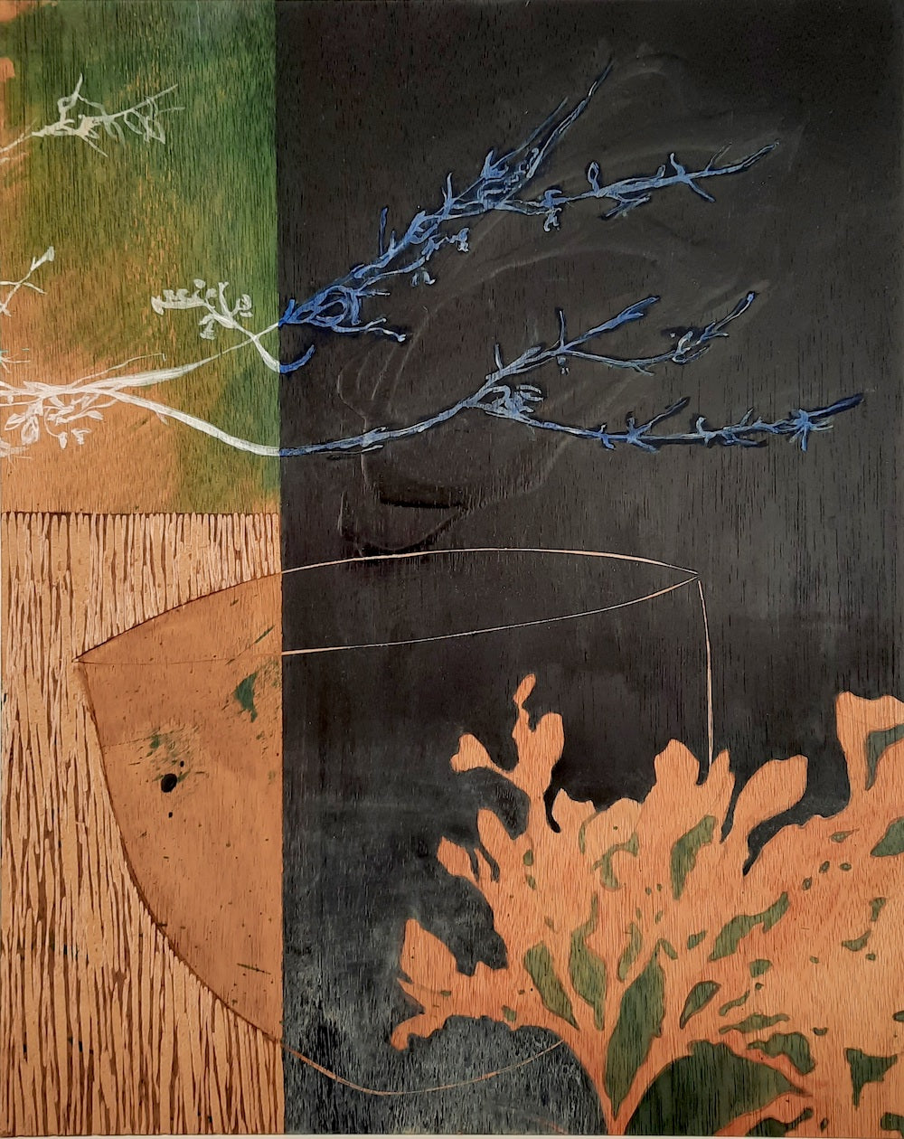 With a clear Japanese influence, this painting invites meanderings of the imagination as you pass through different textures, hidden details, and an inside/outside quality reminiscent of standing at the kitchen sink looking out into the garden and beyond.