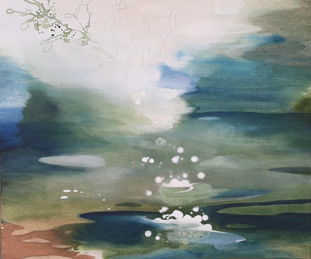 The pure exuberance of a splash, surrounded by ocean greens and blues, and the hint of plant life.