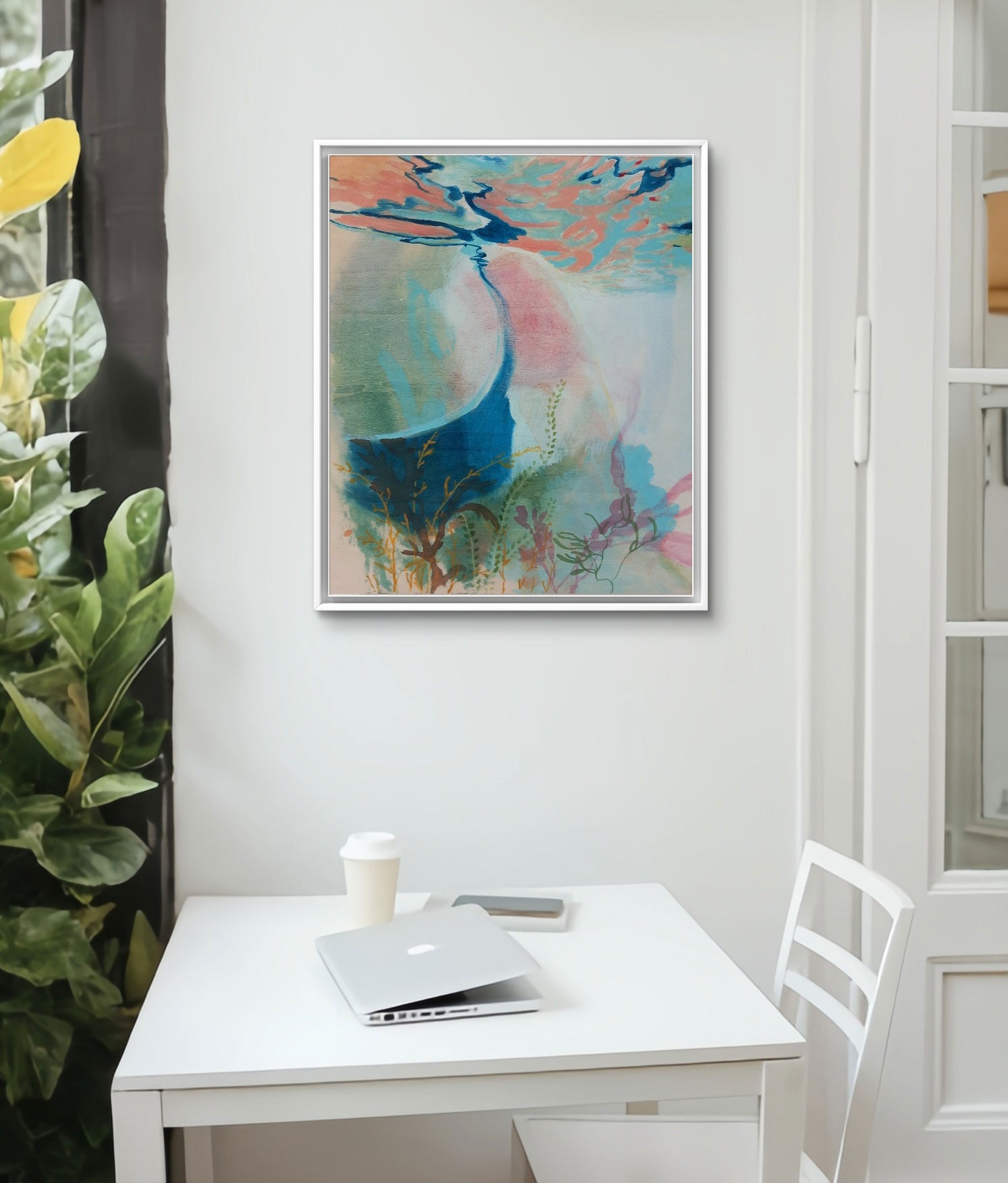 - Framed in a simple white tray frame